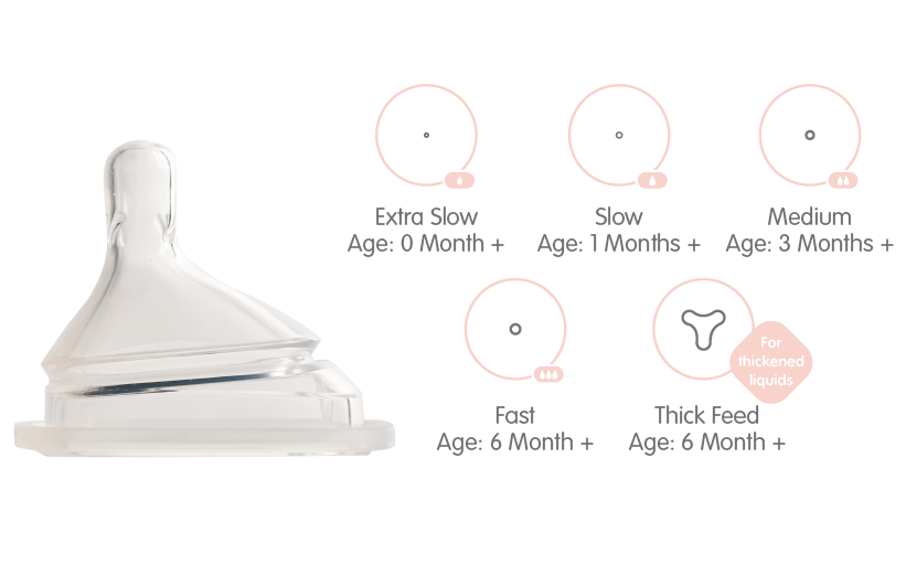 If you are building a feeding bottle, the next step is to choose a teat that is most suited for your baby. Pick from 5 different teat sizes, depending on the age and needs of your child.